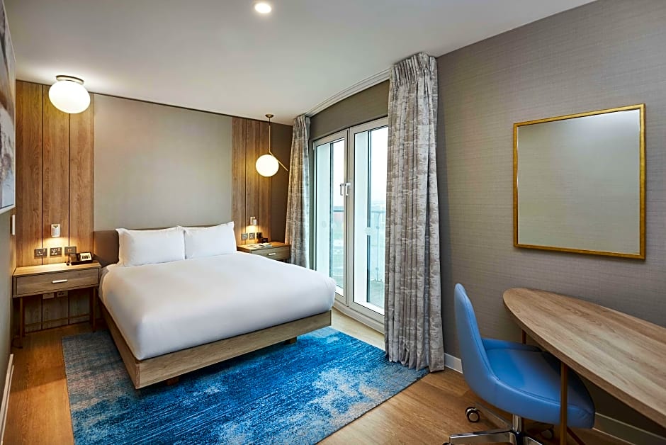 This deluxe king room comes with a king size bed and offers views of the water from the floor-to-ceiling windows.